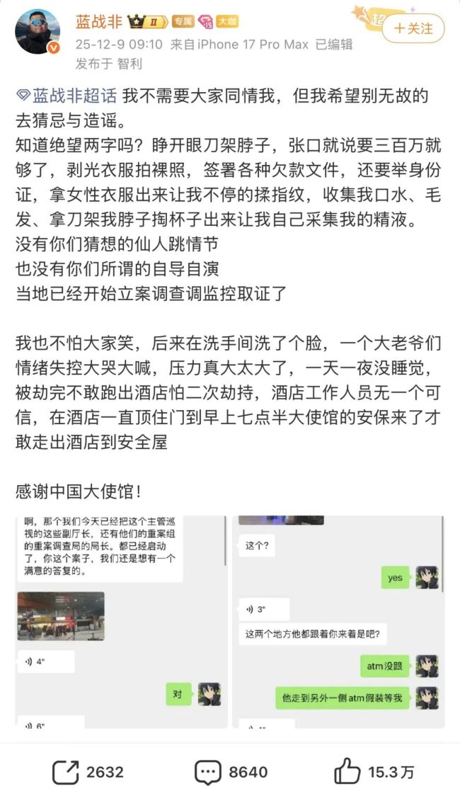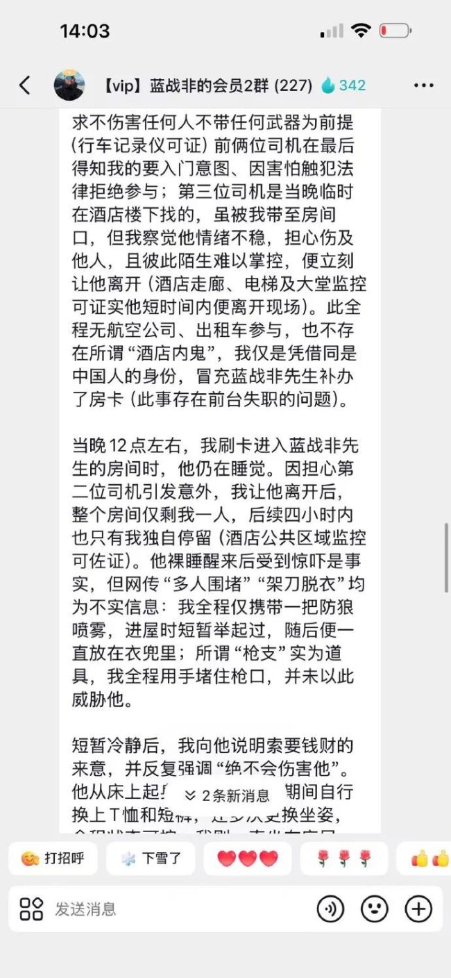 第三位司机是当晚临时在酒店楼下找的,虽被我带至房间口,但我察觉他情绪不稳,担心伤及他人,且彼此陌生难以掌控,便立刻让他离开(酒店走廊、电梯及大堂监控可证实他短时间内便离开现场)。此全程无航空公司、出租车参与,也不存在所谓“酒店内鬼”,我仅是凭借同是中国人的身份,冒充蓝战非先生补办了房卡(此事存在前台失职的问题)。 当晚12点左右,我刷卡进入蓝战非先生的房间时,他仍在睡觉。因担心第二位司机引发意外,我让他离开后,整个房间仅剩我一人,后续四小时内也只有我独自停留(酒店公共区域监控可佐证)。他裸睡醒来后受到惊吓是事实,但网传“多人围堵”“架刀脱衣”均为不实信息:我全程仅携带一把防狼喷雾,进屋时短暂举起过,随后便一直放在衣兜里,所谓“枪支”实为道具,我全程用手堵住枪口,并未以此威胁他。 短暂冷静后,我向他说明索要钱财的来意,并反复强调“绝不会伤害他”。他从床上起身坐到沙发上,期间自行换上T恤和短裤,还多次更换坐姿全程状态可控。我则一直坐在床尾,与他面对面保持至少一米距离,全程无任何肢体接触,更未对他实施暴力胁迫。沟通中,我曾提出“能否当作借钱,我签署借条”,但当时情绪和口气均保持平稳,并未有过激言行。最终他分两笔向我转账共计108.8万元,资金均转入我的实名国内账户。
