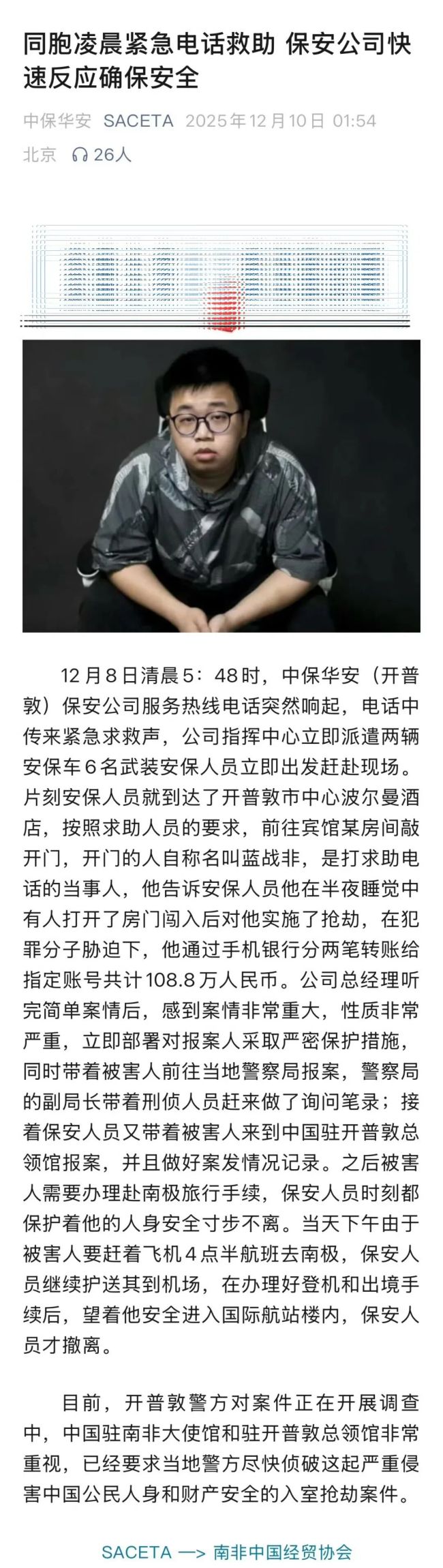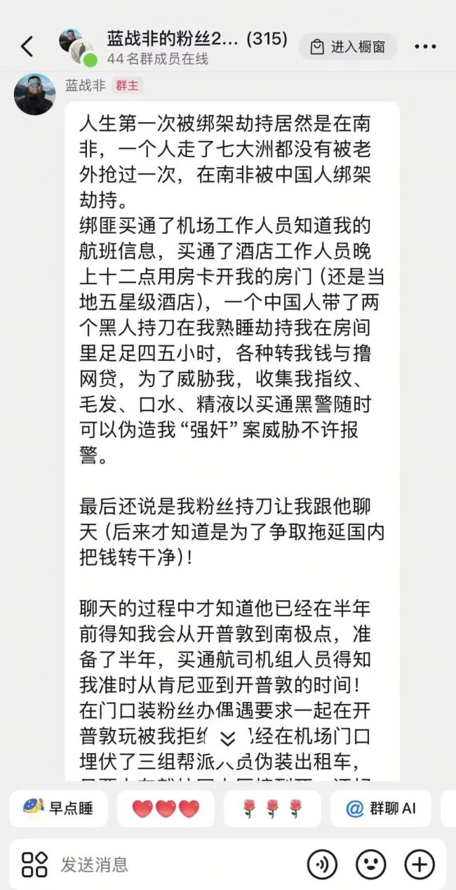 12月8日,千万网红旅行博主蓝战非称在南非开普敦五星级酒店遭中国籍绑匪伙同他人持刀入室绑架,并表示绑匪提前半年布局买通内应,劫持期间强迫转账超百万元并采集生物信息威胁伪造“强奸案”,引发公众对海外安全与隐私保护的深度担忧。