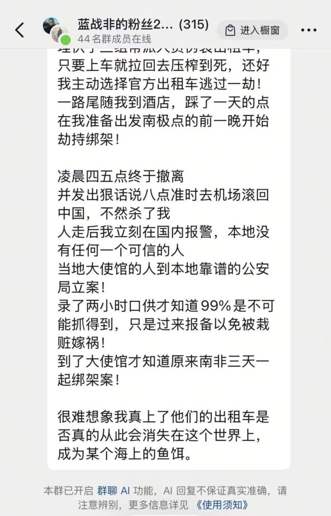 并且否认“蓄谋半年”,称通过蓝战非社交动态得知其从开普敦飞南极行程后,临行前1天才预订机票酒店(携程/去哪儿记录可查),在机场蹲守3天寻找机会。