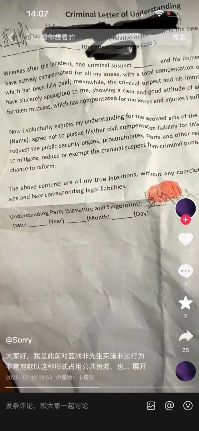 自称犯罪嫌疑人的千字原文:“大家好,我是此前对蓝战非先生实施非法行为的当事人。