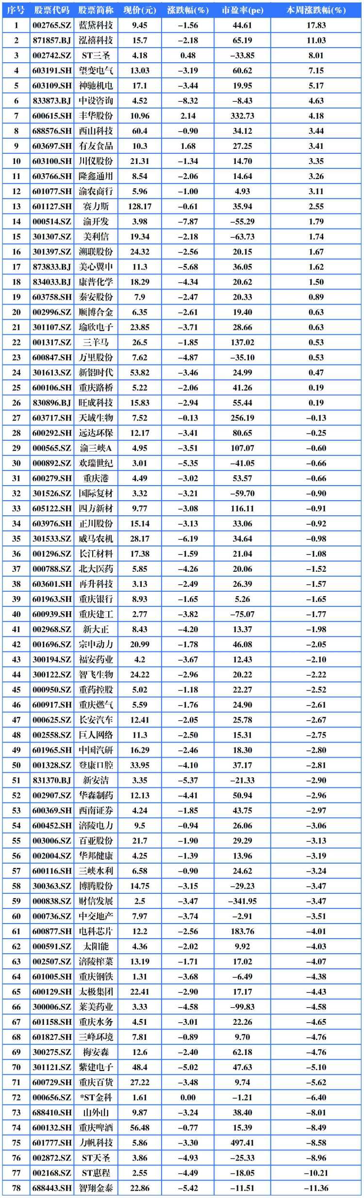 2025年1月10日,结束本周最后一个交易日,本周78家重庆A股,其中收涨26家,收跌52家。