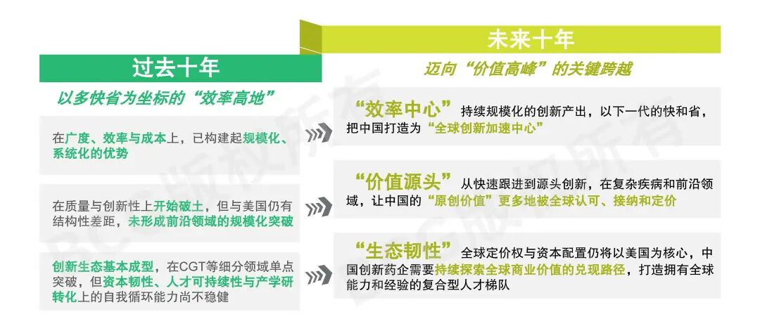 过去十年,中国医药创新以“多、快、省”为核心特征,系统性构建起可规模化、可复制的效率高地。面向未来十年,中国医药创新正处于从效率高地迈向价值高峰的关键拐点。这一跃迁并非对既有优势的简单延伸,而是能力结构的系统性升级:一方面,以AI为代表的新技术将推动“快”与“省”进入下一阶段,使中国进一步深化效率优势,成为全球创新节奏的重要加速器;另一方面,创新重心将向源头机制与前沿疾病领域迁移,持续产出具有全球认可度与定价潜力的原创成果。同时,强化生态韧性将成为支撑长期发展的关键,通过构建可持续的资本结构、复合型人才体系,确保创新能力能够得到持续释放。