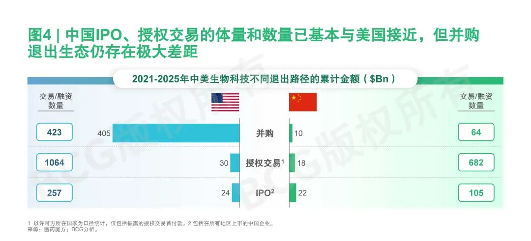 在交易类型上,中国生物科技企业的IPO与授权交易已接近美国水平。过去五年,美国的IPO及授权交易累计总量约为540亿美元,而中国同期累计约400亿美元(参阅图4)。中国创新药企业在资本市场和授权交易方面的活跃度正在快速提升。然而,中国在并购退出通道上仍显不足,美国过去五年通过大规模并购实现的退出总量达4050亿美元,涉及423笔交易,而中国同期仅约100亿美元、64笔交易,且单笔并购交易体量大约仅为美国的六分之一。并购退出通道的缺失,使中国创新药企业的资本生态在早中期融资后的流动性和风险分散能力存在一定的结构性边界。