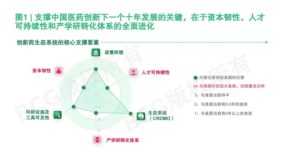 当前,中国医药创新的生态支撑体系可概括为六大核心要素:政策环境、人才可持续性、CRDMO生态、产学研转化体系、科研设施与工具可及性,以及资本韧性。在六大支撑要素中,中国相较美国的差距主要集中在资本韧性、人才梯队的可持续性,以及产学研转化体系的成熟度(参阅图1)。