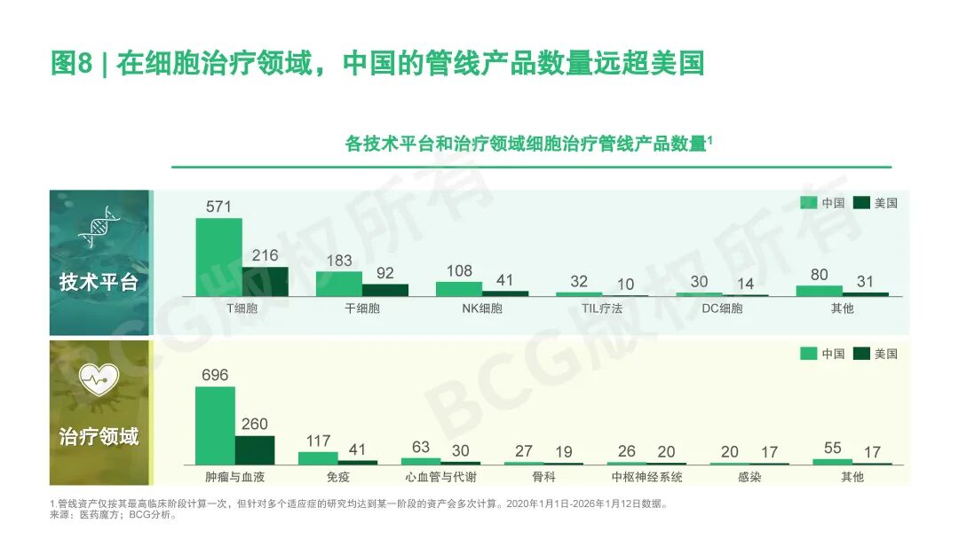 以细胞治疗为例,可以更直观地观察到中国在特定前沿领域中,政策环境与产学研转化体系协同推进所释放出的系统性创新能力。从创新产出看,中国在细胞治疗的管线规模、技术前沿探索及早期临床验证等多个关键维度已相对领先(参阅图7)。