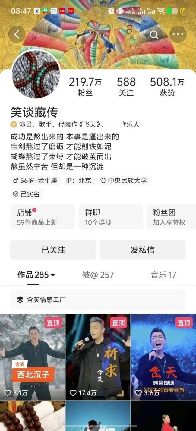 含笑的某社交平台信息显示,目前其账号已经从“含笑”更名为“笑谈藏传”,粉丝219.7万,发布短视频作品285个。其认证信息为演员、歌手。