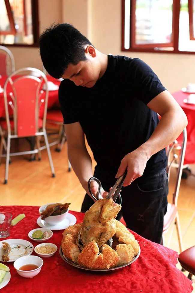 东兴的越式炸鸡,原料上跟越南不一样。东兴的厨师告诉我:“他们把中国的鸡叫工业鸡,越南的鸡是散养居多。”原料品质相比越南有不足,但东兴的炸鸡店也有自己的特色之处。东兴有家名叫孟获炸鲜鸡的店,老板名叫郑金煌,他是本地人,以前曾经在防城港当过厨师,后来回了家,想自己开家店,就托芒街的亲戚帮忙推荐越南饮食,想开一家有差异化的餐厅。“到处去品尝,我发现做炸鸡挺不错的。”郑金煌告诉我,越南炸鸡只需要选料新鲜,经过简单清理和一点点的腌制就会很好吃,“用香茅草和干葱腌制几分钟,主要是为了去腥”。他选择三斤大小的本地小土鸡,“再大肉过多,再小肉就柴”,下油锅前要先煎一遍香茅草,“只有油里有了香茅草的味道,才是越南炸鸡”。