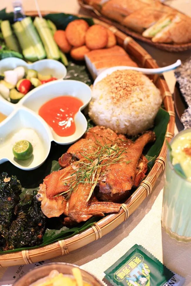 跟法式三明治齐名的小吃是越式炸鸡。为了这次美食采访,我们到越南芒街去了一家专做炸鸡和糯米包鸡的餐厅。老板不让我们探头探脑地往厨房里看,毕竟鸡是生炸,看的就是控制油温和火候的能力,很容易被人偷师。炸鸡外皮酥脆,但里面非常水润。糯米包鸡是用熟糯米把肚子里塞了香料的整鸡牢牢包住,裹成一个大冬瓜形状,在油锅里晃晃悠悠地炸。服务员帮我们把糯米鸡切成一个个小块,那糯米浸了肉汁,变得外焦里油。鸡肉也是一轻咬就滑滑地散开,肉的弹性和绵软兼具。