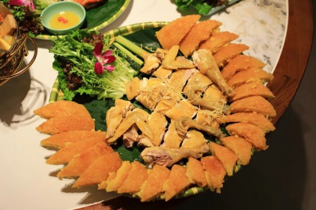 越南芒街的糯米包鸡是将其切成一个个小块,糯米浸上肉汁,鸡肉弹牙且绵软(缓山 摄)