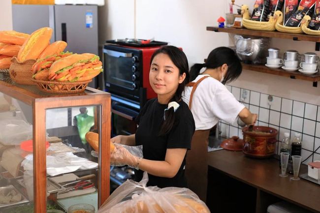 “雪贞的面包店”店主阮氏雪贞(前)是一位越南芒街姑娘,店里的面包馅料融合了中越两国的口感(缓山 摄)