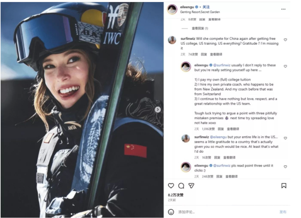 有人留言称,她在美国接受教育和训练,获得诸多资源,却仍选择为中国参赛。对此,谷爱凌罕见正面回应,态度强硬,表示本不打算回应此类言论,但对方言辞失实。