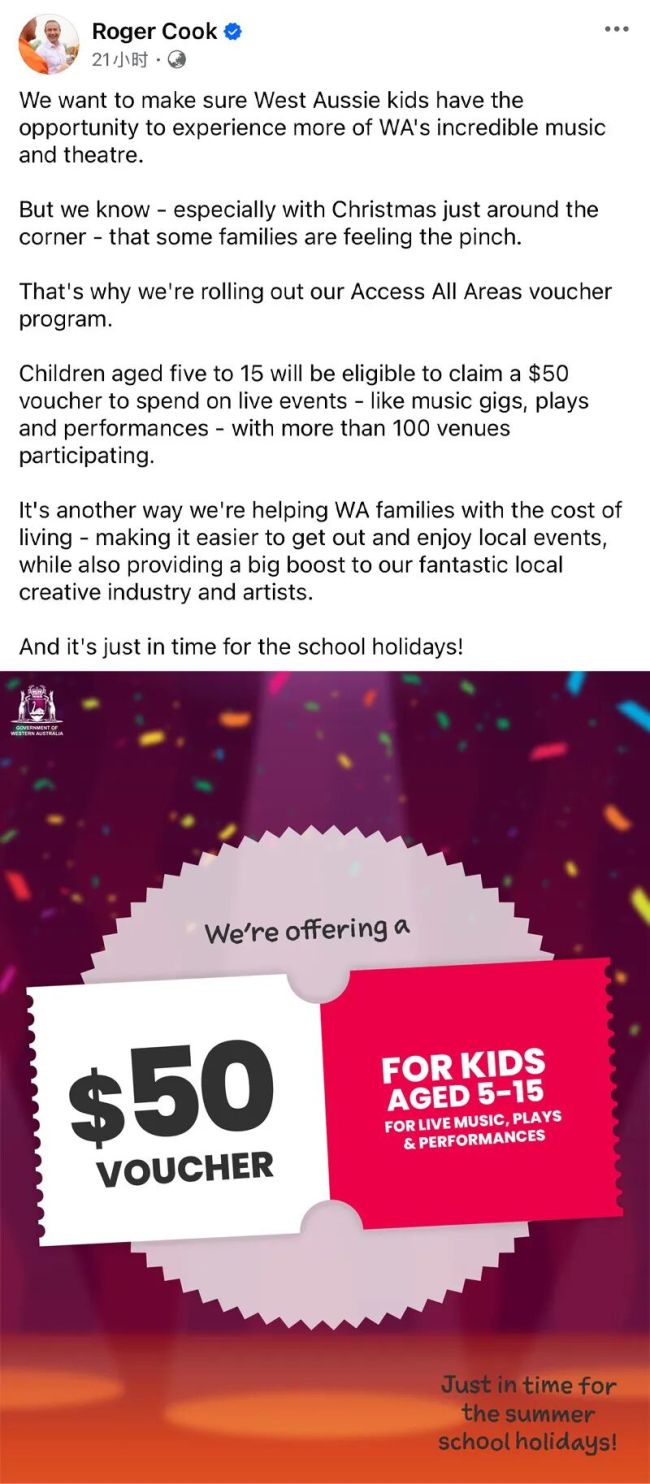 对此,西澳州长库克发文称:“我们希望确保西澳大利亚州的孩子们有机会体验更多当地精彩的音乐与戏剧演出。但我们深知圣诞将至之际一些家庭正面临经济压力。因此,我们推出了‘通行无阻’代金券计划。”