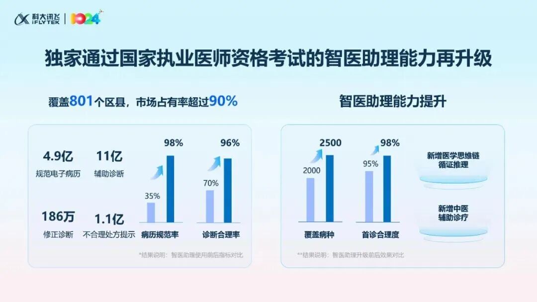 目前,智医助理已经为4.9亿份电子病历给出了11亿次的辅助诊断,修改了186万不合理的诊断,和1.1亿不合理的处方提示,把基层的诊断合理率从70分提升到96分。安徽几乎每一个村医工作室、乡镇卫生院和社区医院都在使用智医助理,全国已经有超过800个县区在使用——中国县级医院超过1800个,这意味着,科大讯飞已经覆盖了近一半。