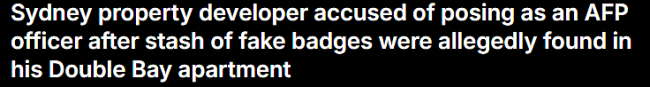 悉尼一名房地产开发商因假冒联邦警察遭逮捕起诉,警方在其住处查获多枚伪造警徽及大量仿真武器。