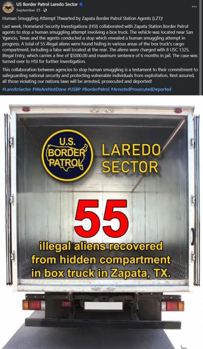 事实上就在今年9月,德州边境巡逻队刚刚抓了个更离谱的——一辆卡车塞了55个人.......