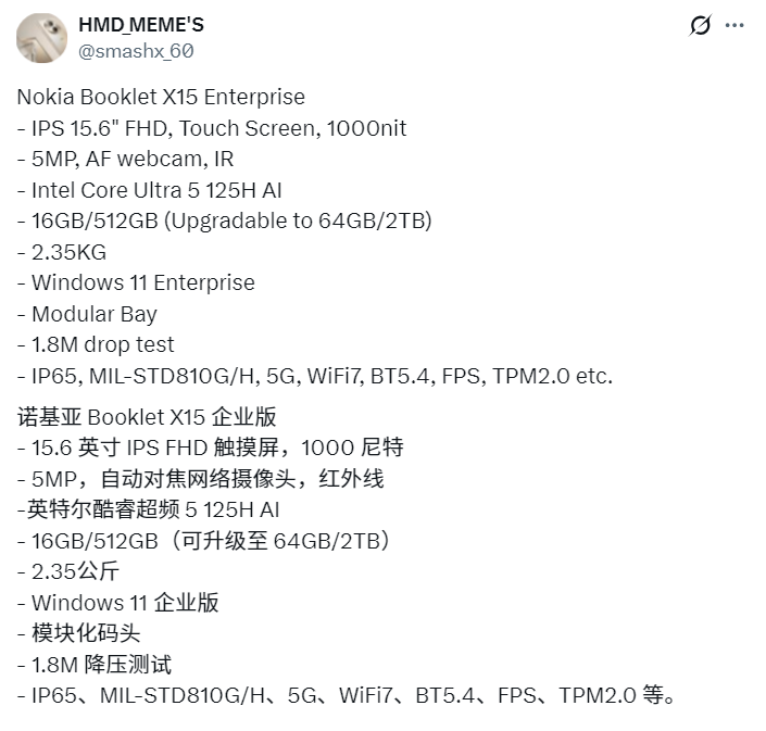 Booklet X15 Enterprise配备15.6英寸IPS触控屏,分辨率1920×1080,屏幕亮度达1000尼特,可在强光直射下保持可读性。
