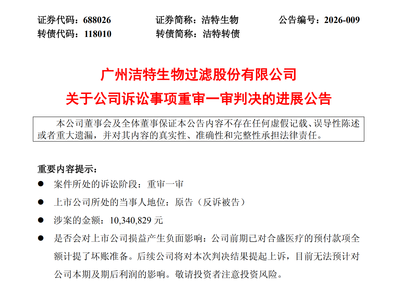 对于本次判决结果,洁特生物明确将提起上诉,并披露公司前期已对合盛医疗的预付款项全额计提了坏账准备,目前无法预计本次判决及后续上诉对公司本期及期后利润的影响。