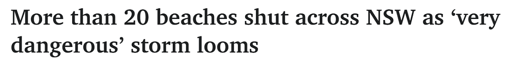 Dee Why、Manly、Mona Vale、Narrabeen、Bronte、Clovelly与Tamarama等20多个海滩已关闭,全州正遭受极端天气袭击。