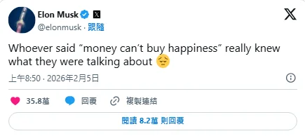 马斯克当天在X平台发文写道:“说出‘金钱买不到幸福’的人,是真的懂这句话。”贴文还搭配了一个略显悲伤的表情符号,语气耐人寻味。短短数小时内,这则贴文便吸引超过5万则留言,网友反应两极,有人调侃、有人共鸣,也有人借机抛出更深层的社会议题。