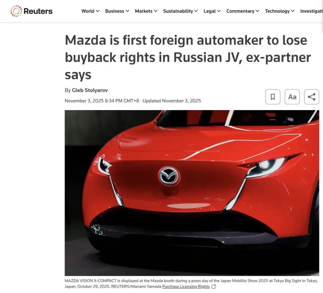 2022年10月,马自达以1欧元的象征性价格,出售了原本在俄罗斯合资企业中拥有的50%股权,并保留了3年期的回购权。