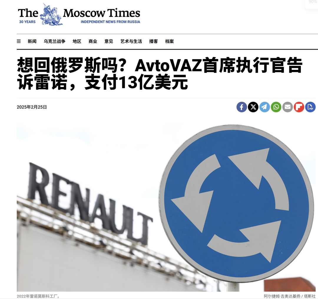 2025年2月,雷诺集团CEO基于当时暂缓的局势,对外放出想行使回购权、重回俄罗斯市场的风。