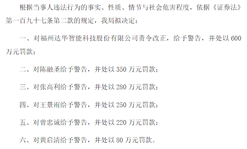 福建证监局表示,根据当事人违法行为的事实、性质、情节与社会危害程度,依据《证券法》第一百九十七条第二款的规定,我局拟决定:对达华智能责令改正,给予警告,并处以600万元罚款。同时,时任达华智能董事长、总经理陈融圣,时任达华智能董事、副总经理、董事会秘书张高利,时任达华智能董事、财务总监王景雨,时任达华智能董事、总经理曾忠诚,时任达华智能独立董事兼审计委员会主任委员黄启清均被给予警告,并分别被处以350万元、280万元、250万元、220万元、80万元罚款。
