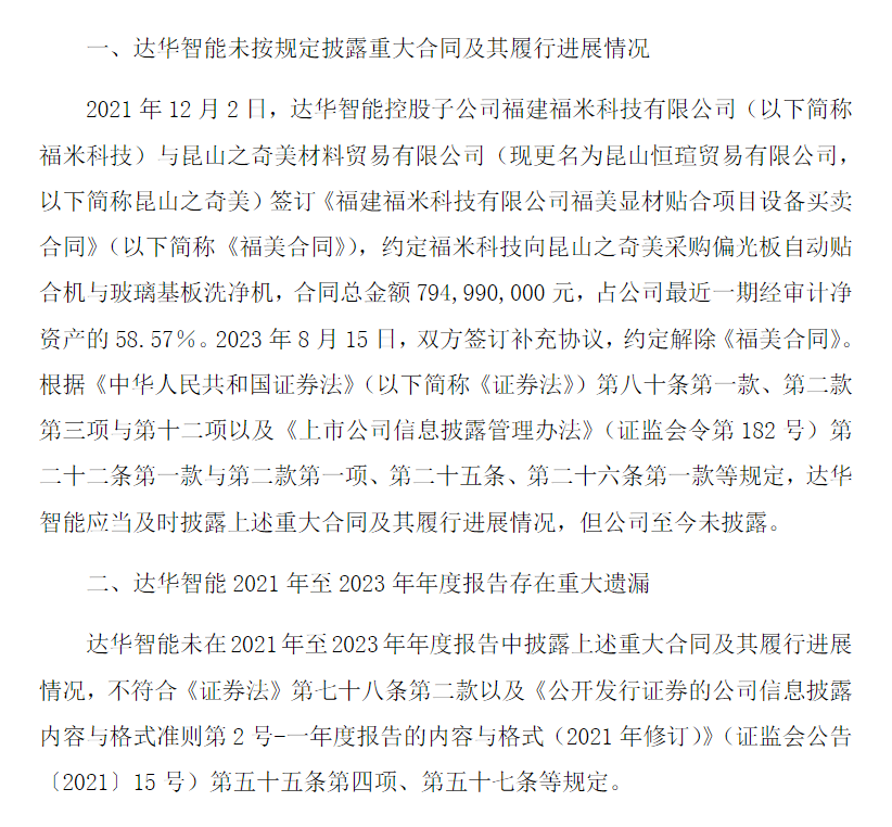 据公告披露,达华智能未按规定披露重大合同及其履行进展情况2021年12月2日,达华智能控股子公司福建福米科技有限公司(以下简称福米科技)与昆山之奇美材料贸易有限公司(现更名为昆山恒瑄贸易有限公司,以下简称昆山之奇美)签订《福建福米科技有限公司福美显材贴合项目设备买卖合同》(以下简称《福美合同》),约定福米科技向昆山之奇美采购偏光板自动贴合机与玻璃基板洗净机,合同总金额794,990,000元,占公司最近一期经审计净资产的58.57%。2023年8月15日,双方签订补充协议,约定解除《福美合同》。根据《中华人民共和国证券法》(以下简称《证券法》)第八十条第一款、第二款第三项与第十二项以及《上市公司信息披露管理办法》(证监会令第182号)第二十二条第一款与第二款第一项、第二十五条、第二十六条第一款等规定,达华智能应当及时披露上述重大合同及其履行进展情况,但公司至今未披露。