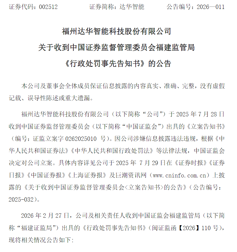 2月27日晚间,达华智能发布公告披露,公司及相关责任人收到中国证监会福建监管局(以下简称福建证监局)出具的《行政处罚事先告知书》(以下简称《告知书》)。同一天达华智能表示,自2026年3月3日开市起被实施其他风险警示,股票简称由“达华智能”变更为“ST达华”;股票代码不变,仍为“002512”;股票交易日涨跌幅限制为5%。