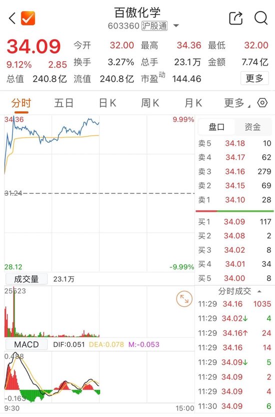 11月27日开盘,百傲化学直线拉升,盘中一度触及涨停。截至午间收盘,涨幅为9.12%,报34.09元/股。