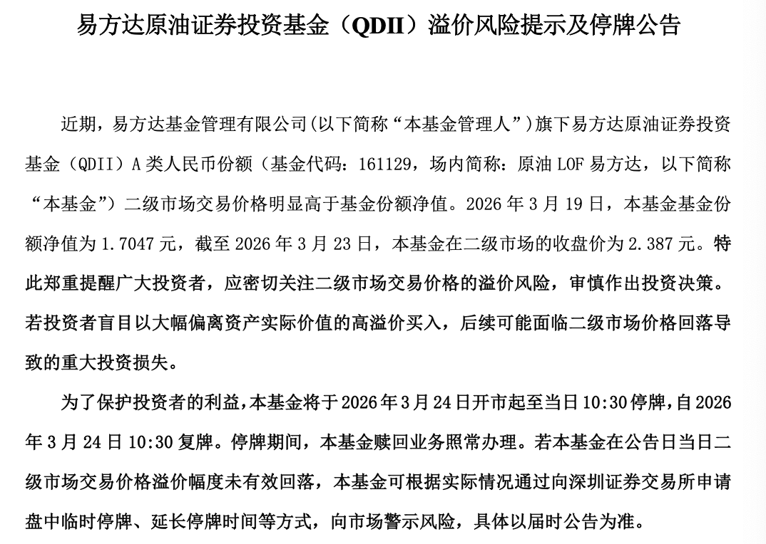 易方达也公告,为了保护投资者的利益, 原油LOF易方达(161129)将于2026年3月24日开市起至当日10:30停牌,自2026年3月24日10:30复牌。若3月24日二级市场交易价格溢价幅度未有效回落,该基金有权通过向深圳证券交易所申请盘中临时停牌、延长停牌时间的方式,向市场警示风险。该基金最近一个月走势持续上扬,近一个月涨幅同样超过48%,截至3月23日收盘,原油LOF易方达(161129)再创历史新高达2.387元。