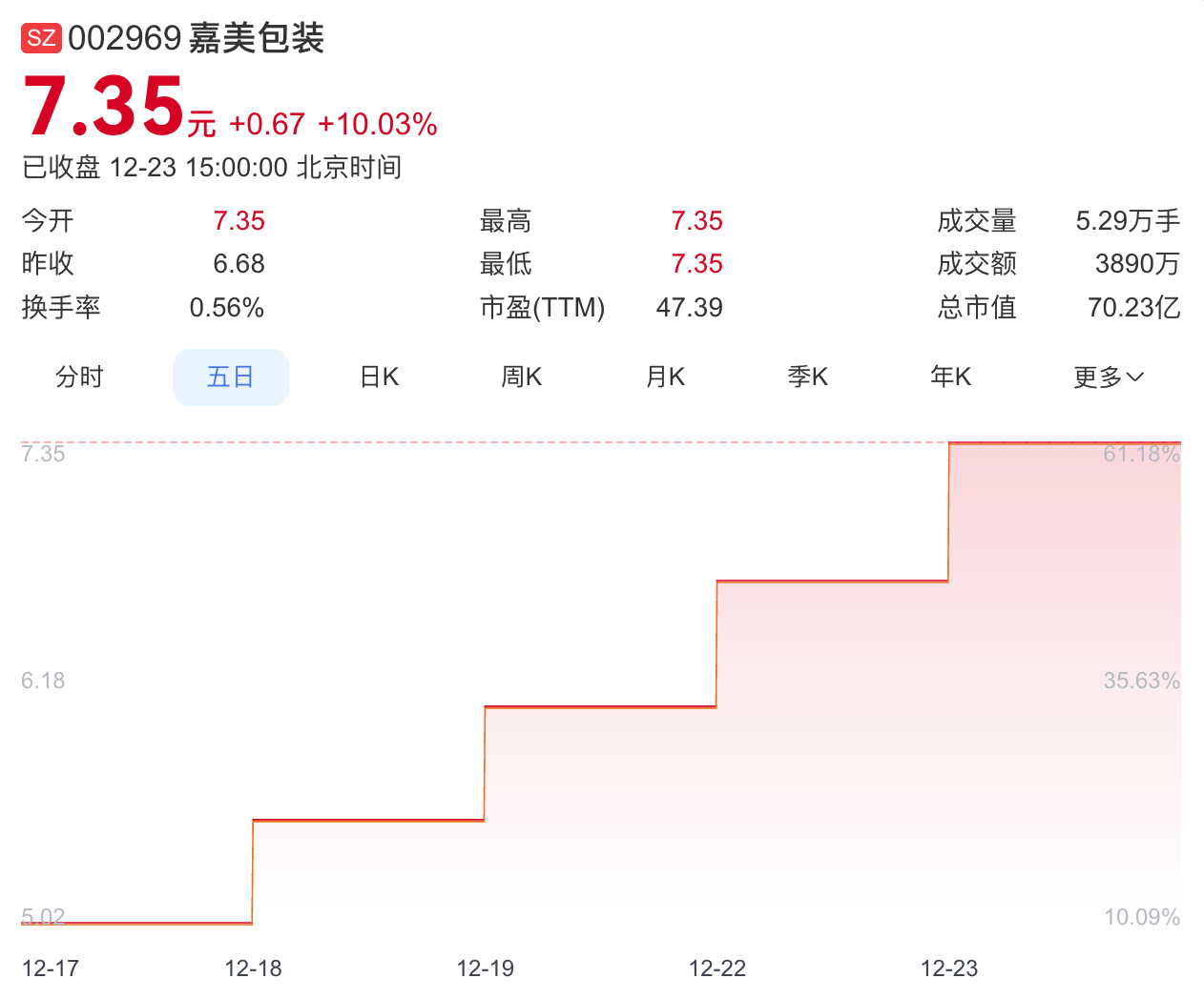 在被追觅科技创始人俞浩以20多亿元收购控股权后,金属包装公司嘉美包装(002969.SZ)迎来五连板。12月23日,嘉美包装连续第5天涨停,最新股价7.35元,市值达到70.23亿元。