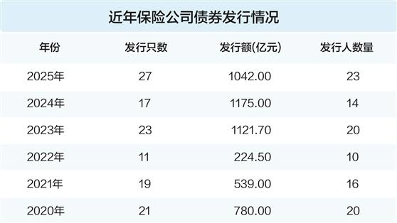Wind数据显示,2025年,23家保险公司发行资本补充债券、永续债共27只,合计金额1042亿元。此前,保险公司分别在2023年、2024年发债1121.7亿元、1175亿元。这也意味着,险企发债规模连续三年超千亿元,保险公司发债融资的第四个高峰仍在延续。
