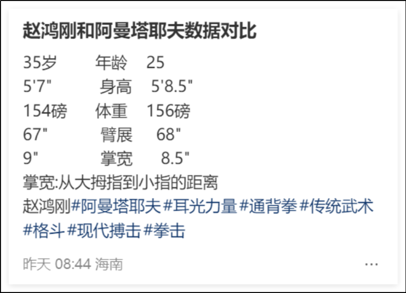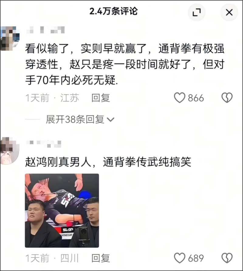 他们吐槽赵鸿刚作为通背拳的高手,在自己比对手多打巴掌的情况下,还被对手KO,那学的不是三脚猫功夫吗?