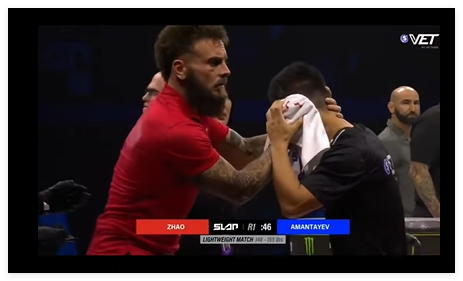 话不多说,第一回合,阿曼塔耶夫先打,他一巴掌就让赵鸿刚眉骨出血;