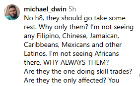 “为什么只有他们?我没看到菲律宾人、中国人、牙买加人、加勒比人、墨西哥和其他拉丁裔,也没看到非洲裔。为什么总是他们?难道只有他们在做技术工?只有他们受影响吗?这是事实,不是仇恨。”