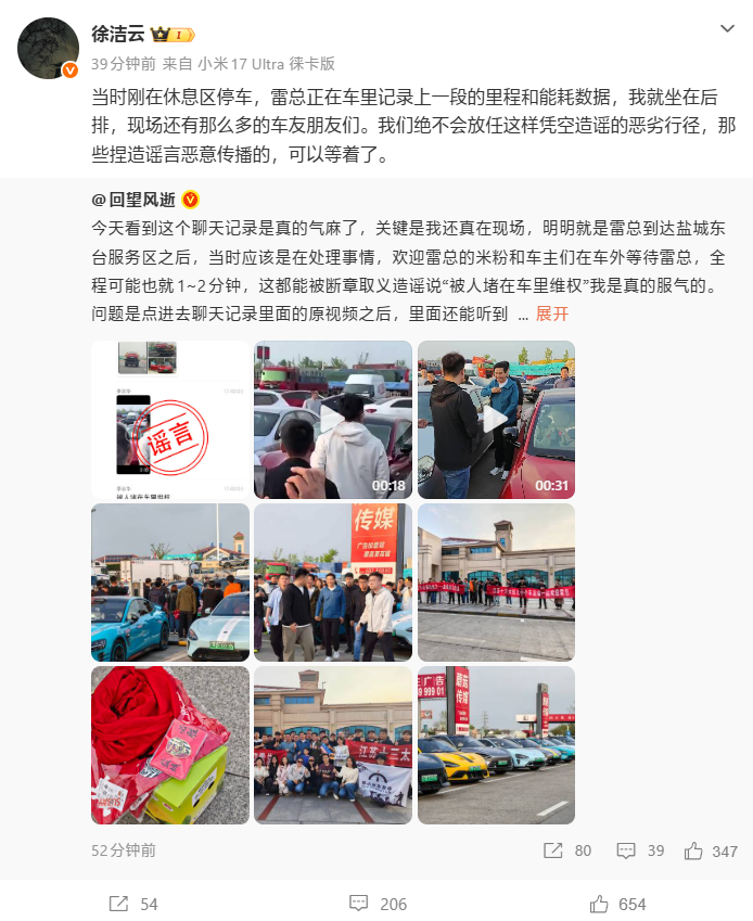 徐洁云还表示:当时刚在休息区停车,雷总正在车里记录上一段的里程和能耗数据,我就坐在后排,现场还有那么多的车友朋友们。