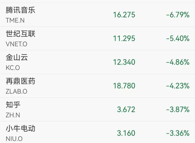 热门中概股腾讯音乐跌超6%,世纪互联跌5%,金山云跌近5%,再鼎医药跌超4%,网易、京东跌近2%,携程跌近1.7%,B站跌1.5%。上涨个股中,禾赛科技涨超5%,阿特斯太阳能涨超3%,理想涨1.6%。