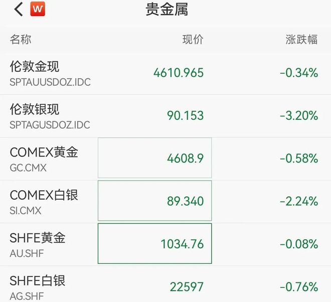 贵金属全线下跌,黄金、白银继续走低。现货白银短线快速大跳水,跌幅超3%,跌破91美元/盎司,现货黄金失守4620美元/盎司,日内跌超0.34%,COMEX黄金跌幅扩大至0.58%。