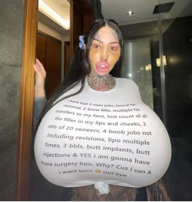 她还曾注射过多唇部填充,导致嘴巴无法闭合,还因在胸部纹身引发感染,险些变成败血症……