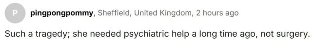 “真是个悲剧,很早以前她就需要接受精神治疗,而不是整形手术。”