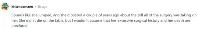 “感觉她是自己跳下去的,她几年前就发帖讲过所有手术给她造成的影响。她并非死在手术台上,但我觉得过度整形和她的死是有关联的。”