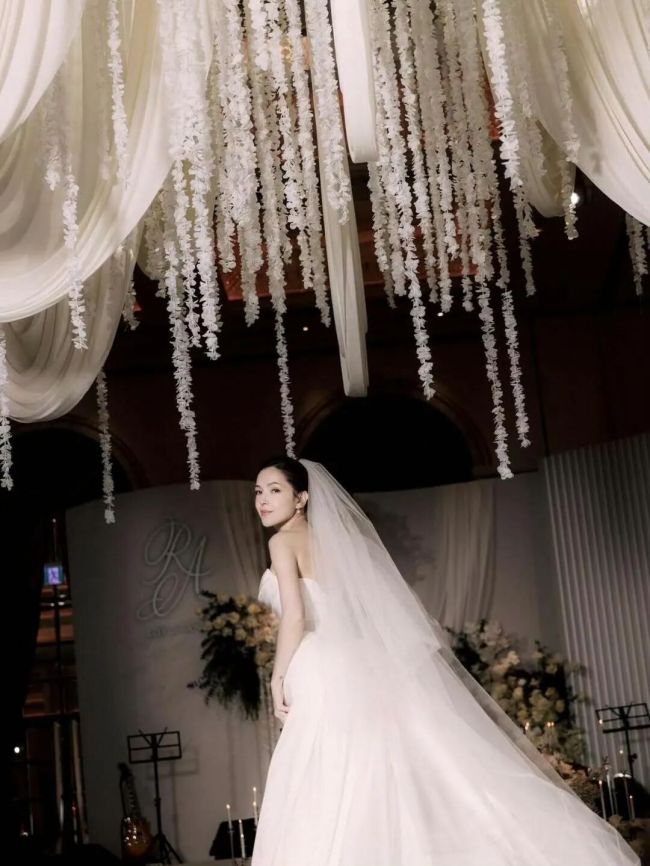 许玮甯的的头纱是由外婆1950年的嫁衣改制而来,衬着她精致而深邃的脸,映着她雪白的肌肤,在灯光下美得让人恍神。