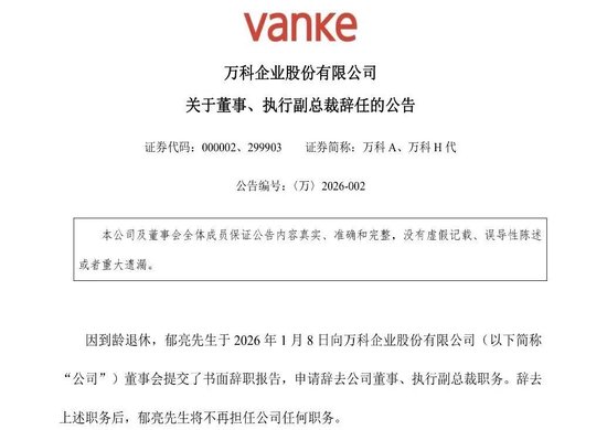 1月8日晚间,万科发布公告宣布,因到龄退休,公司董事、执行副总裁郁亮已于当日向董事会提交书面辞职报告,辞去其在公司担任的所有职务,辞呈即日生效。