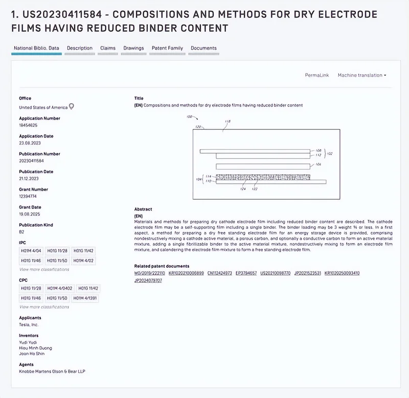 而干法电极技术,是同时推翻这两座大山的最优路径之一。特斯拉是用一种利用温和混合工艺和一种特殊粘合剂制作独立干电极片的方法。相关专利显示,特斯拉设计了一种纯干式正极,能够以极少的粘合剂(低至1.25%)提供最大能量,从而提升电池的能量密度、续航里程及性能。同时,该工艺能更好地保持粒子完整性,延长电池寿命。在工艺层面更符合固态电池的技术方向。