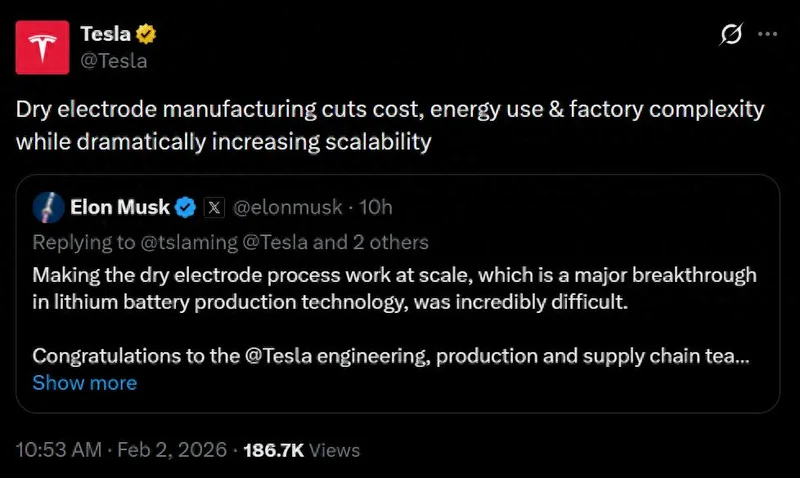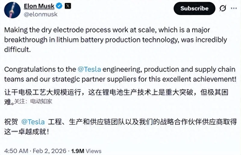 这意味着特斯拉正实现 4680 电池正负极干电极工艺的大规模应用,他特别向特斯拉的工程、生产、供应链团队及战略合作伙伴致以祝贺,确认公司已解决这一长期困扰电池行业的技术难题。