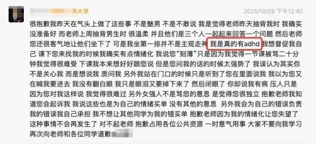 在这段话中,她特别指出自己患有“adhd”,称自己有精神类的疾病,无法集中注意力。