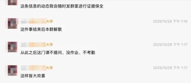 自此,胡老师宣布,这件事结束之后,群解散,从此这门课不提问、无作业、不考勤,这样“皆大欢喜”。