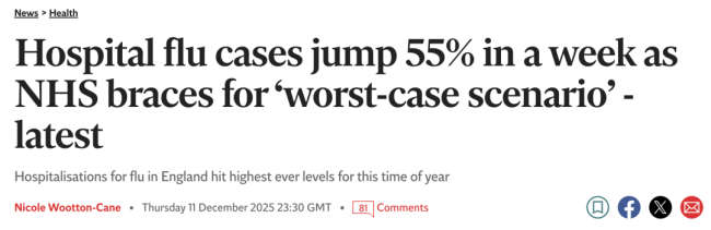 毫不夸张地说,现在的英国仿佛一秒回到新冠疫情肆虐的年代,因为感染A(H3N2) ‘super flu’之后,大量患者情况严重,高烧、周身疼痛、甚至伴有严重并发症,