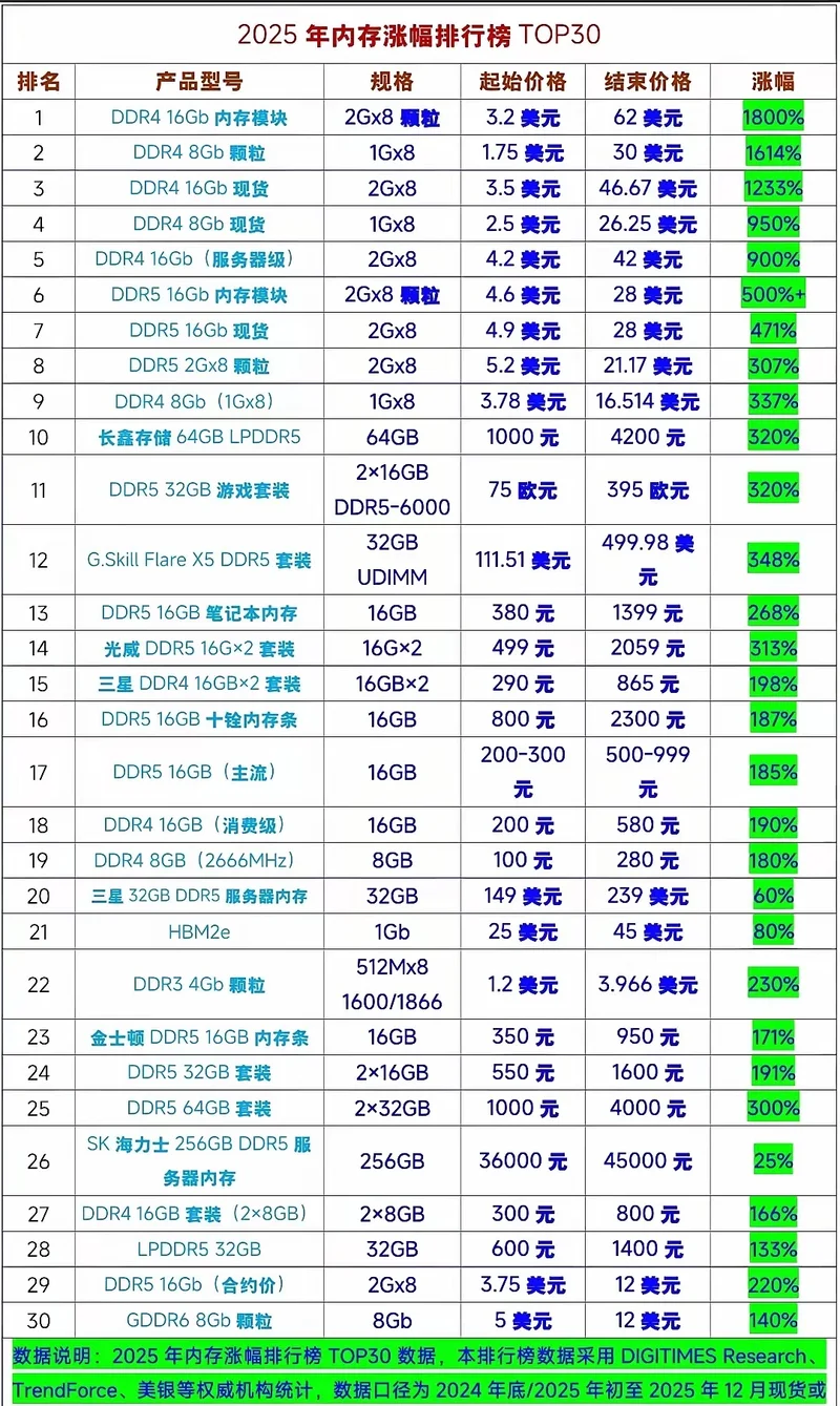 当然除了有色金属大幅上涨之外,内存的涨幅也相当夸张,大多数内存条涨幅都超过100%,极个别产品涨幅甚至超过1000%,相当于涨了10倍以上。