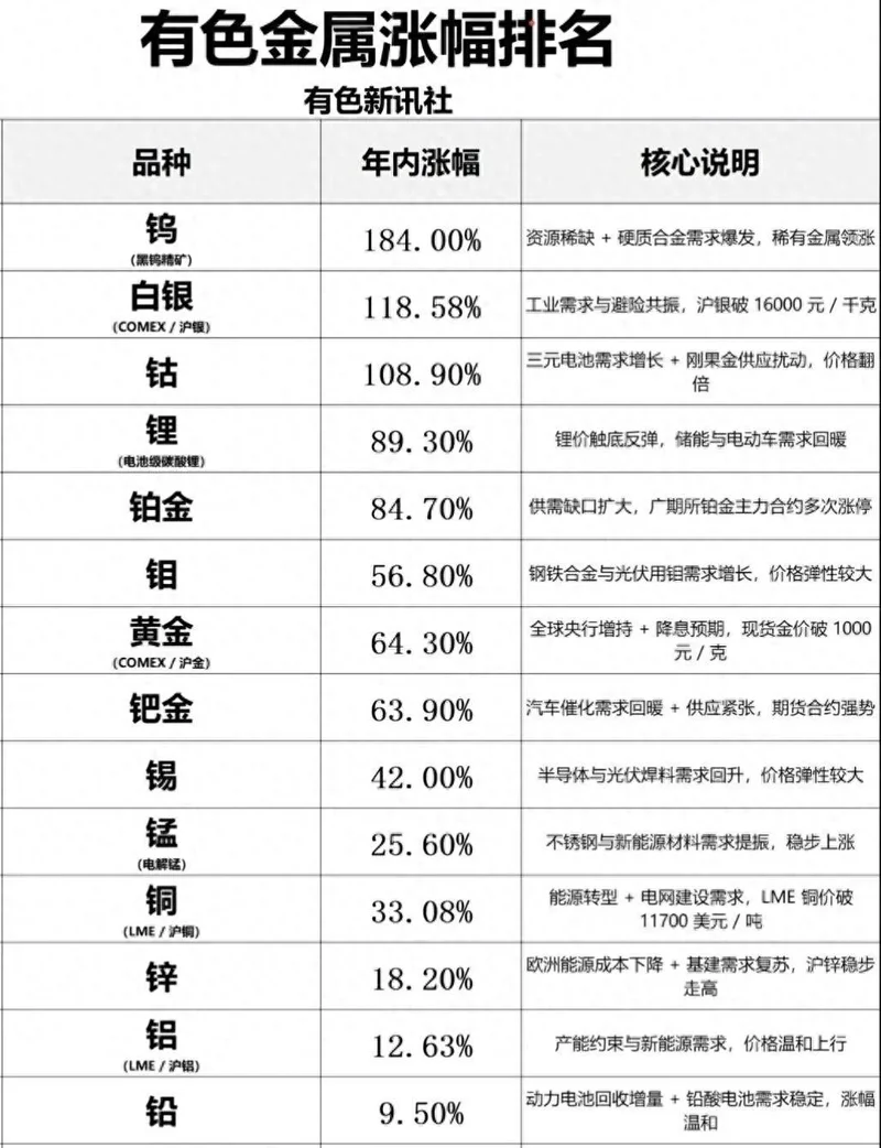 另外包括钯金、锡、锰、铝、锌等其他有色金属也出现了不同程度的上涨。